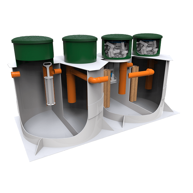 В третьей камере также находятся погружные биофильтры, ускоряющие переработку органики, а в переливе между третьей и четвертой камерами – сетчатый фильтр-патрон.