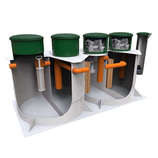 В третьей камере также находятся погружные биофильтры, ускоряющие переработку органики, а в переливе между третьей и четвертой камерами – сетчатый фильтр-патрон.