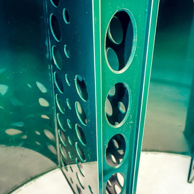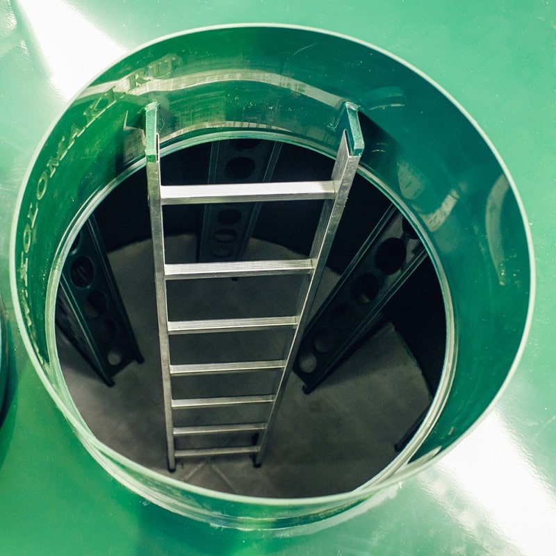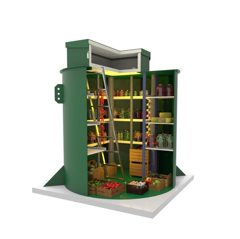 Корпус погреба Kellari 5 – цилиндр, изготовленный из гомогенного полимера расчетной толщины. Дополнительно корпус усилен внутренним каркасом жесткости – профилированными полками, опирающимися на вертикальный профиль. Цилиндрическая форма существенно превосходит по прочности резервуары прямоугольной конструкции.