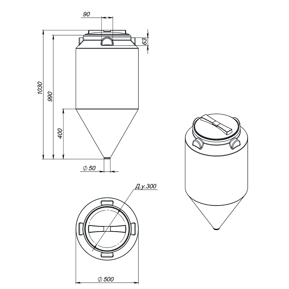 Конусное дно гарантирует полный слив веществ, а также значительно облегчает уход за емкостью
