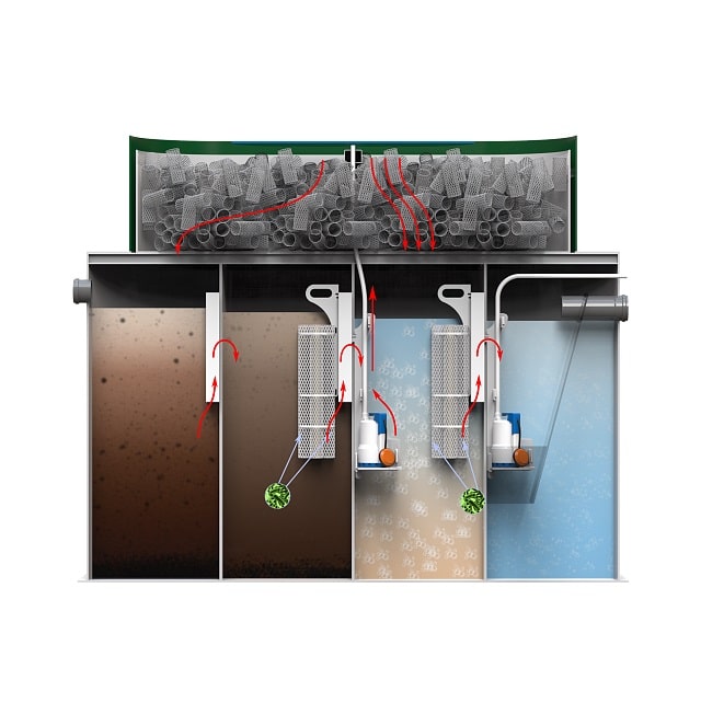 Система очистки хорошо переносит поступление залпового сброса сточных вод благодаря наличию специально организованных переливов между камерами, использованию погружных трубчато-пластинчатых биофильтров и наличию пирамидального отстойника в 4-й камере системы.