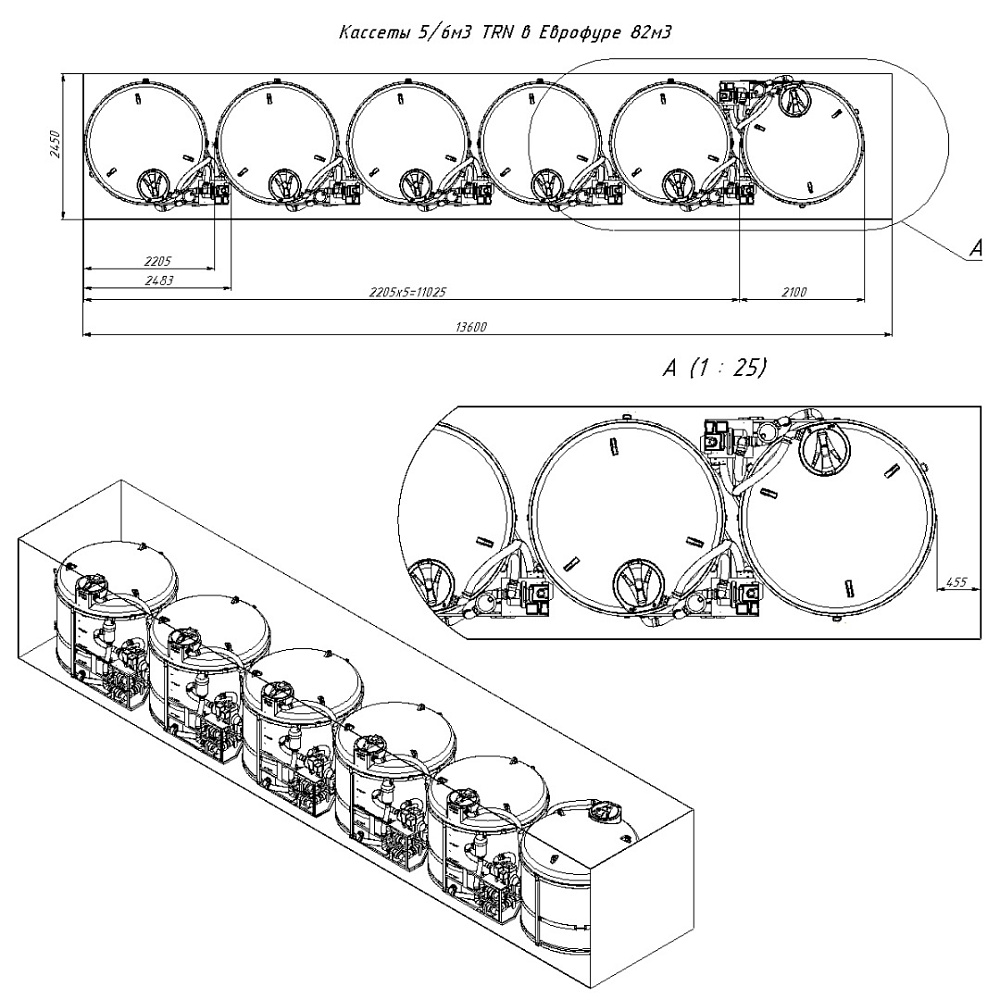 Емкость кассеты оснащена градуированной мерной шкалой, оборудована откидной крышкой с поплавковым дыхательным клапаном и имеет смещенную от центра широкую горловину. Наклонная лестница с трапом (приобретается отдельно) обеспечивает безопасный доступ к крышке емкости. Для проведения погрузо-разгрузочных работ на обрешетках кассет предусмотрены проушины.